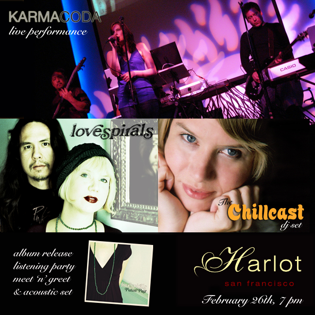 To celebrate the release of Lovespirals’ new album, Future Past, San Francisco electronica act, Karmacoda, are hosting a very cool Happy Hour event at Harlot. Featuring a Chillcast DJ set, Lovespirals meet & greet and short acoustic set, plus a full Karmacoda performance, this is one party you won’t want to miss! Ryan and Anji will also be on hand to autograph eco-friendly digipacs of Future Past (and their previous 3 albums, as well.) This will be the first time Lovespirals have performed live in San Fran, and their first public performance since 2006, not counting their late-2007 virtual concert in Second Life. This is a very special night and we hope you’ll be there to share it with us! Be sure to arrive early as this event starts promptly at 7pm and ends at 10pm. You can RSVP on our Facebook Event Page.